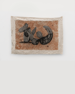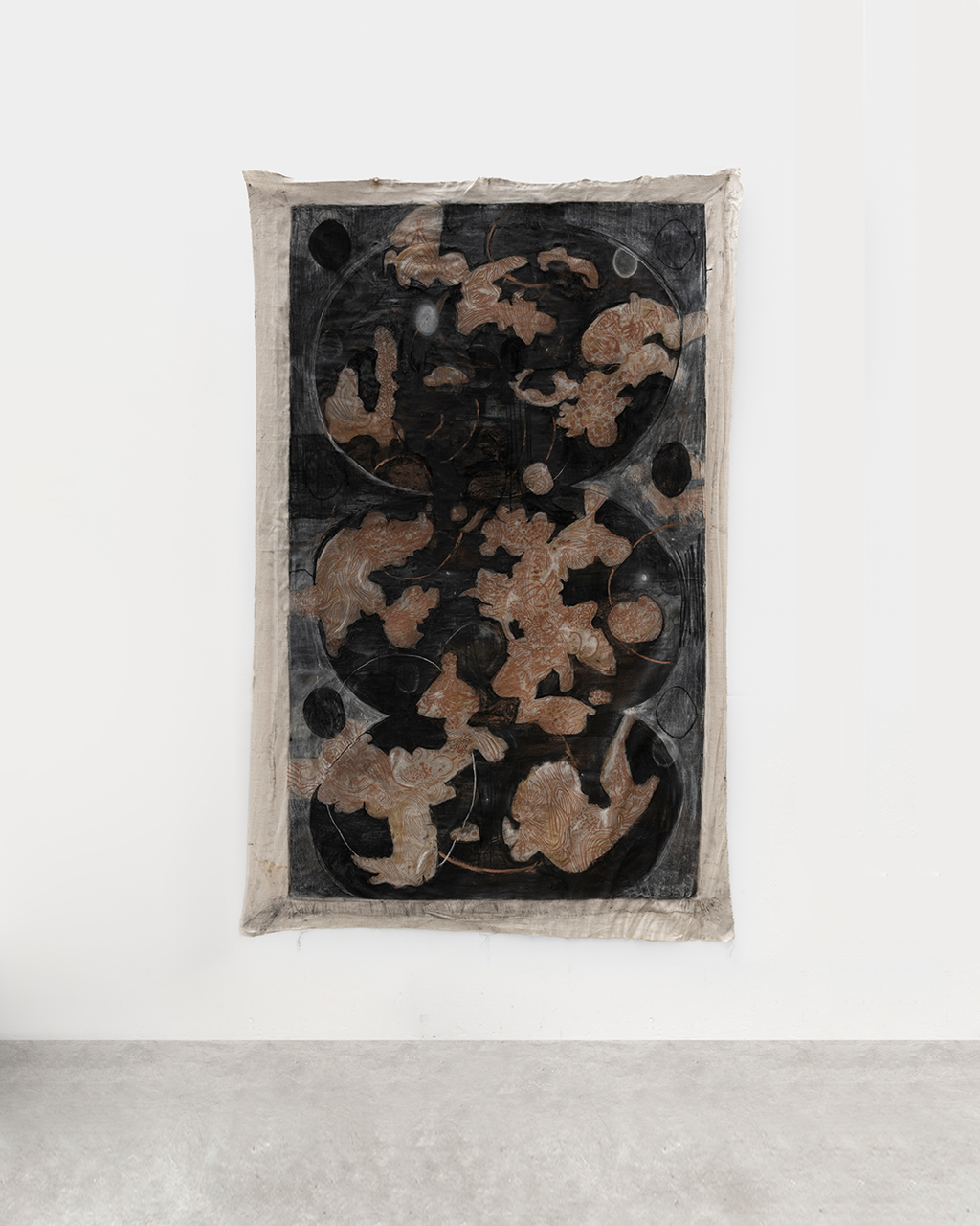 Esse entendimento do fazer escultórico se estende à pintura e ao desenho, que surgem como desdobramentos do processo. As lonas pintadas, originalmente usadas para manter o barro úmido ou para amassá-lo, carregam vestígios do trabalho e funcionam como superfícies onde a escultura se torna visível por outros meios.