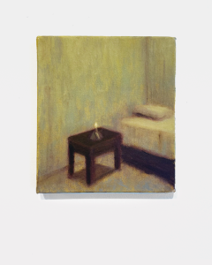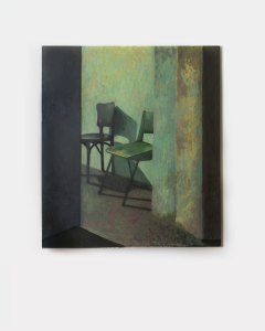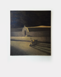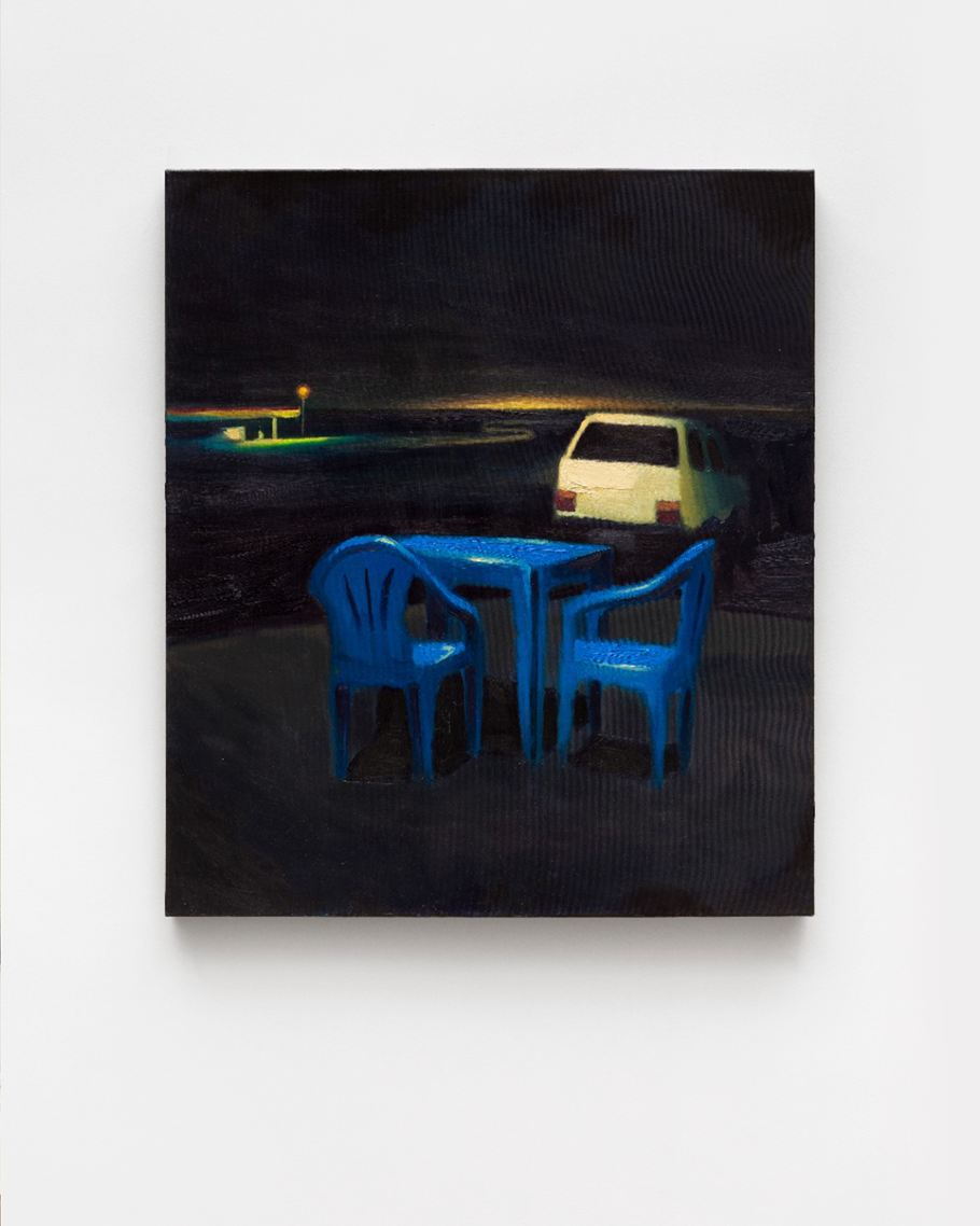 Suas pinturas constroem atmosferas de suspensão e isolamento. Estradas, bares, postos de gasolina e espaços vazios surgem ao amanhecer ou ao cair do dia, em paisagens atravessadas pela memória. A luz acentua o caráter ambíguo da cena, situada entre o trivial e o enigmático. Com isso, a pintura lança um diálogo latente com o cinema brasileiro contemporâneo, especialmente com os filmes de estrada “O céu de Suely” e “Viajo porque preciso, volto porque te amo”, referências que também elaboram o sertão cearense como espaço de deslocamento e introspecção.
